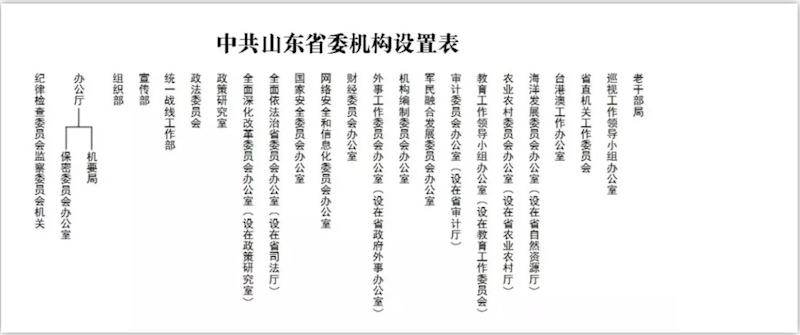 中共山東省委設(shè)置紀檢監(jiān)察機關(guān)1個,計入機構(gòu)限額的工作機關(guān)15個(設(shè)在相關(guān)部門的省委議事協(xié)調(diào)機構(gòu)的辦事機構(gòu)不計入機構(gòu)限額)。其中,紀律檢查委員會與監(jiān)察委員會合署辦公,實行一套工作機構(gòu)、兩個機關(guān)名稱;辦公廳掛省檔案局牌子;組織部掛省公務(wù)員局牌子;宣傳部掛省新聞出版局、省版權(quán)局、省政府新聞辦公室、省精神文明建設(shè)委員會辦公室、省電影局牌子;統(tǒng)一戰(zhàn)線工作部掛省政府僑務(wù)辦公室牌子;臺港澳工作辦公室掛省政府臺港澳事務(wù)辦公室牌子;網(wǎng)絡(luò)安全和信息化委員會辦公室掛省互聯(lián)網(wǎng)信息辦公室牌子。教育工作委員會與省教育廳合署辦公,不計入機構(gòu)限額。 此外,設(shè)置工作機關(guān)管理的機關(guān)2個。其中,保密委員會辦公室(省國家保密局)、機要局(省密碼管理局)由辦公廳管理。